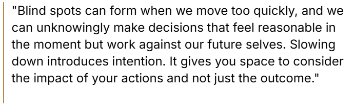 Writing down your goals is the easy part. The harder part is consistently making decisions that align with them. Even small, seemingly isolated financial choices can have long-term consequences. Blind spots can form when we move too quickly, and we can unknowingly make decisions that feel reasonable in the moment but work against our future selves. Slowing down introduces intention. It gives you space to consider the impact of your actions and not just the outcome.